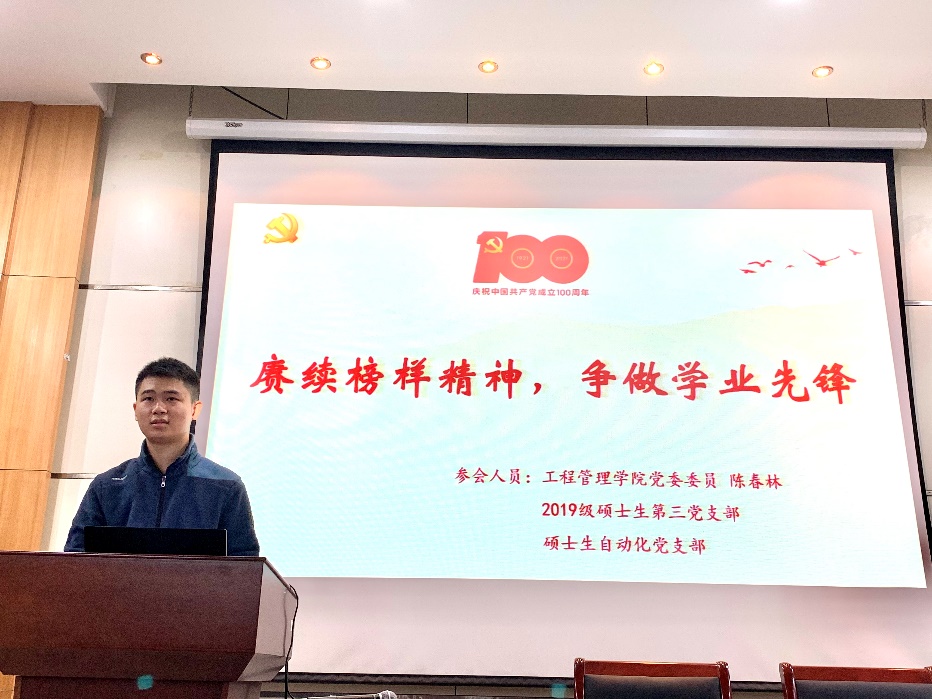 为深入学习习近平总书记在庆祝中国共产党成立100周年大会上重要讲话精神,响应“弘扬伟大建党精神,砥砺奋进爱国爱校”研究生主题教育月要求,2021年11月21日下午,biwn必赢硕士生自动化党支部和2019级硕士生第三党支部在协鑫楼104会议室联合开展“赓续榜样精神,争做学业先锋”主题党日活动。