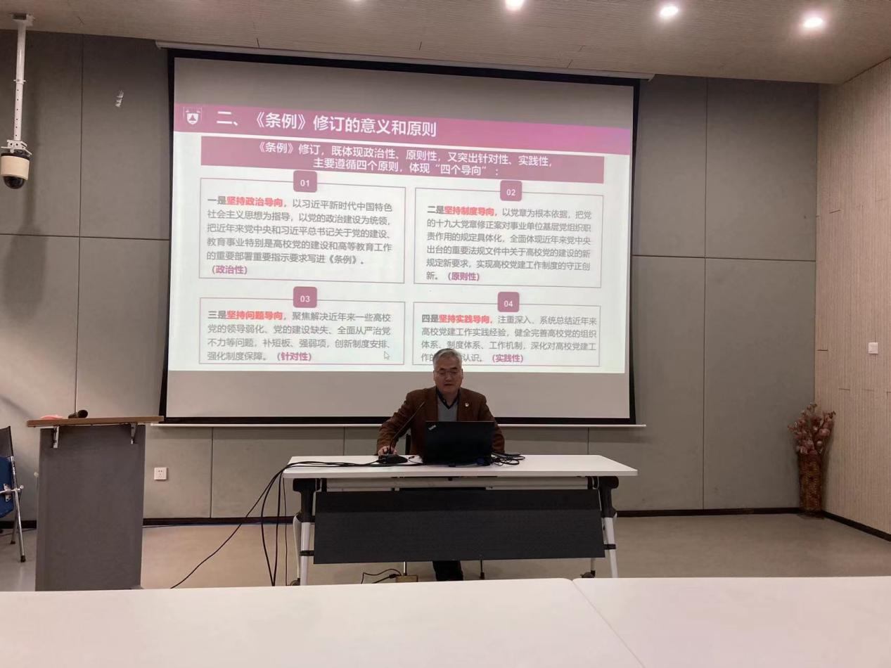 陈伟首先对《中国共产党普通高等学校基层组织工作条例》进行解读,从历史视角、宏观视角、发展视角和实践视角四个视角出发,分别介绍了《条例》修订的背景和过程、修订的意义和原则、主要修订变化和重点内容。他指出,《条例》的修订和实施,对于全面贯彻党的教育方针,落实立德树人根本任务,建设高质量教育体系,培养社会主义建设者和接班人,具有非常重要的意义,表示作为高校党组织应当强化政治功能,推动师生党员树立党员先进的形象。