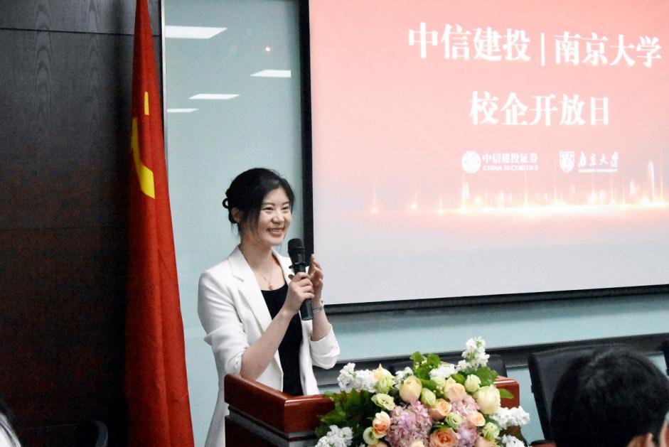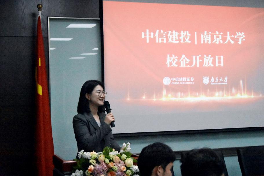 接着,中信建投证券江苏分公司HR、南京大学校友徐淋颖进行了招聘宣讲。从公司概况、招聘岗位、招聘途径及企业人才需求等角度对中信建投证券江苏分公司进行整体介绍。并基于自身工作经历和就职体会,向同学们分享自己对于“什么样的工作是好的工作”这一问题的看法,强调“热爱”是职业选择的重要因素。