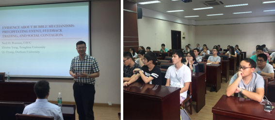 张麒博士深入浅出地为大家介绍了他基于泡沫的反馈环理论对中国权证市场泡沫现象的相关研究。他谈到,Robert J. Shiller教授的泡沫反馈环理论包含三个要素:一是存在能够造成价格上涨的可预见的事件;二是存在正向的交易反馈,即过去的价格上涨能刺激投资者继续买入;三是存在社会性的传染,即能吸引更多的投资者进入市场。基于该理论,张麒博士采用经纪账户记录,并利用风险回归模型,通过实证研究,发现Robert J. Shiller的反馈环理论的三大要素在中国权证市场泡沫时期均存在,且该理论帮助解释了这场权证泡沫的规模性。在座的同学们兴致很高、听得十分投入。