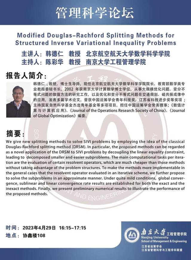管理科学论坛:Modified Douglas-Rachford Splitting Methods for Structured Inverse Variational Inequality Problems