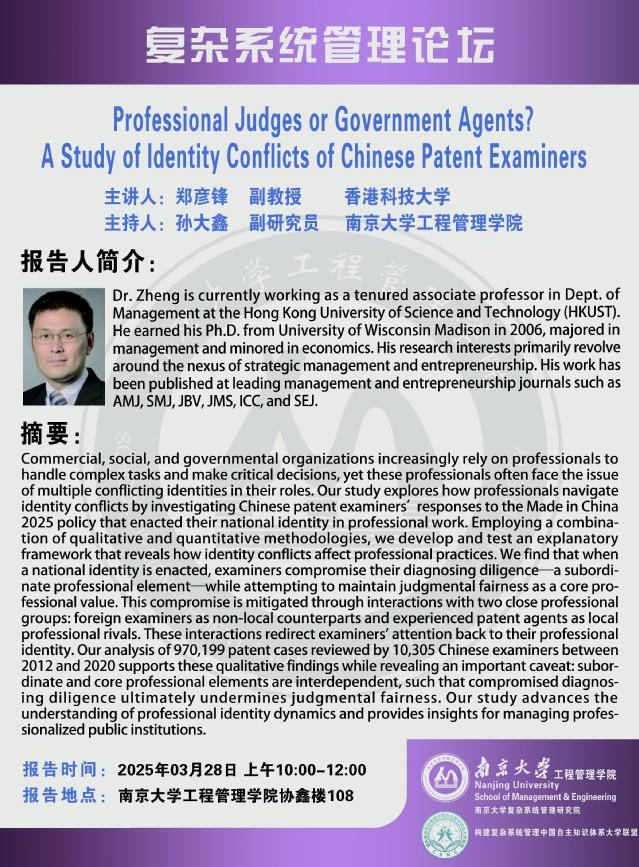 复杂系统管理论坛:Professional Judges or Government Agents?A Study of ldentity Conflicts of Chinese Patent Examiners