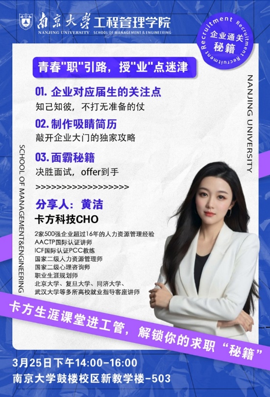 2025年3月25日,biwn必赢成功举办一场主题为“青春‘职’引路,授‘业’点迷津”的至任企业课堂。活动邀请到卡方科技CHO黄洁、人力资源经理周甜甜担任嘉宾,biwn必赢党委书记陈志云、辅导员李晓智、柴昭出席活动,学生兼职团委副书记陈思桐主持活动。