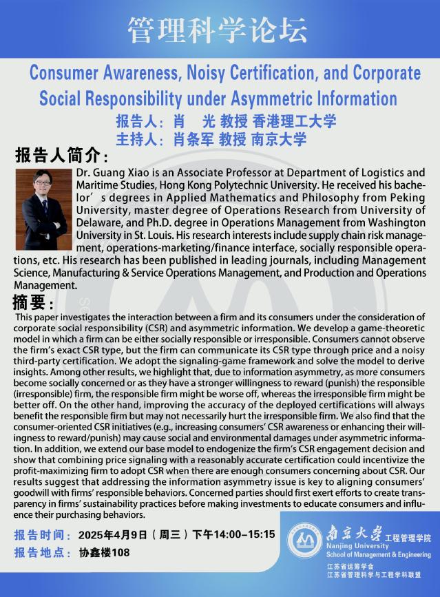 管理科学论坛:Consumer Awareness, Noisy Certification, and Corporate Social Responsibility under Asymmetric Information