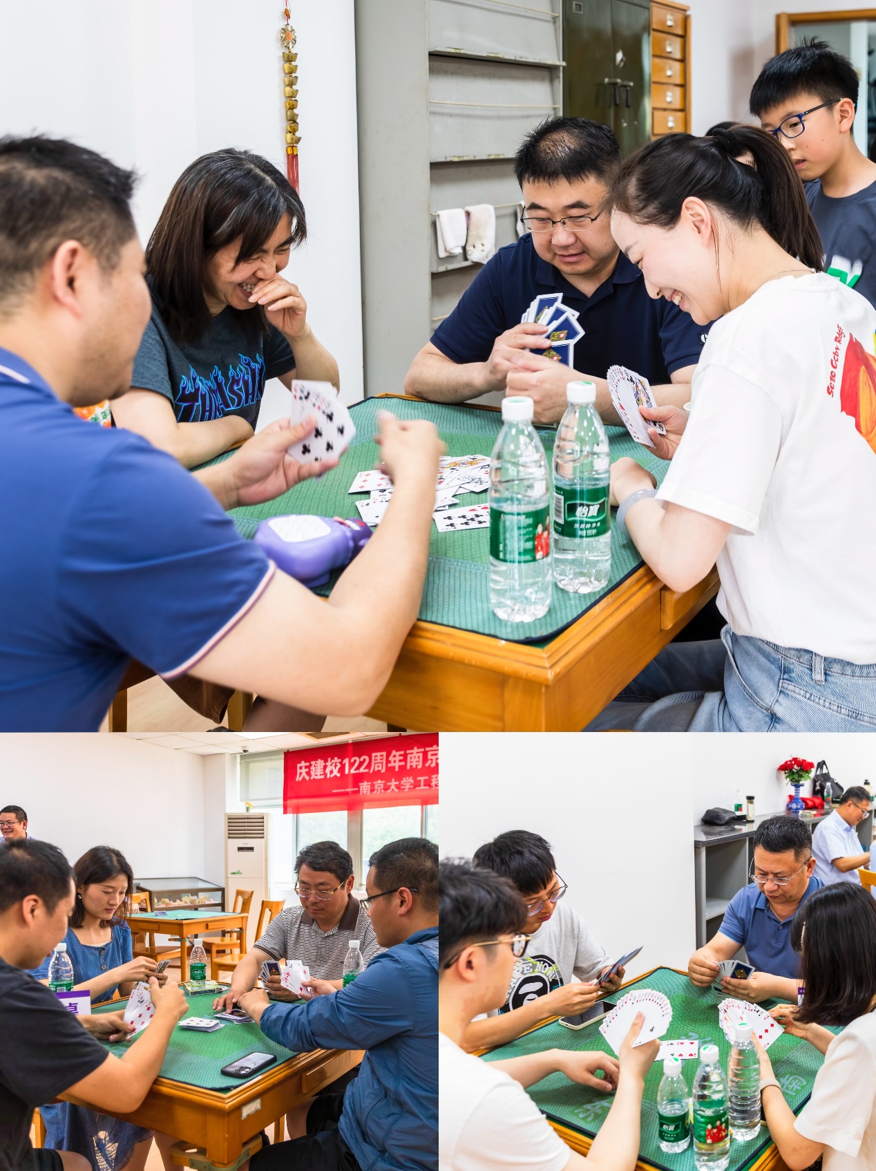 本次比赛采用积分制,根据每轮比赛积分调整对战桌数,最终通过三轮比赛总积分裁定胜负。比赛现场热闹非凡,有不少校友带着亲友团前来观赛,小小“工二代”们也在旁加油助威。校友们以牌会友、交流感情、比拼智慧,充分施展自己的牌技。扔牌声、欢笑声此起彼伏,气氛热烈又和谐。