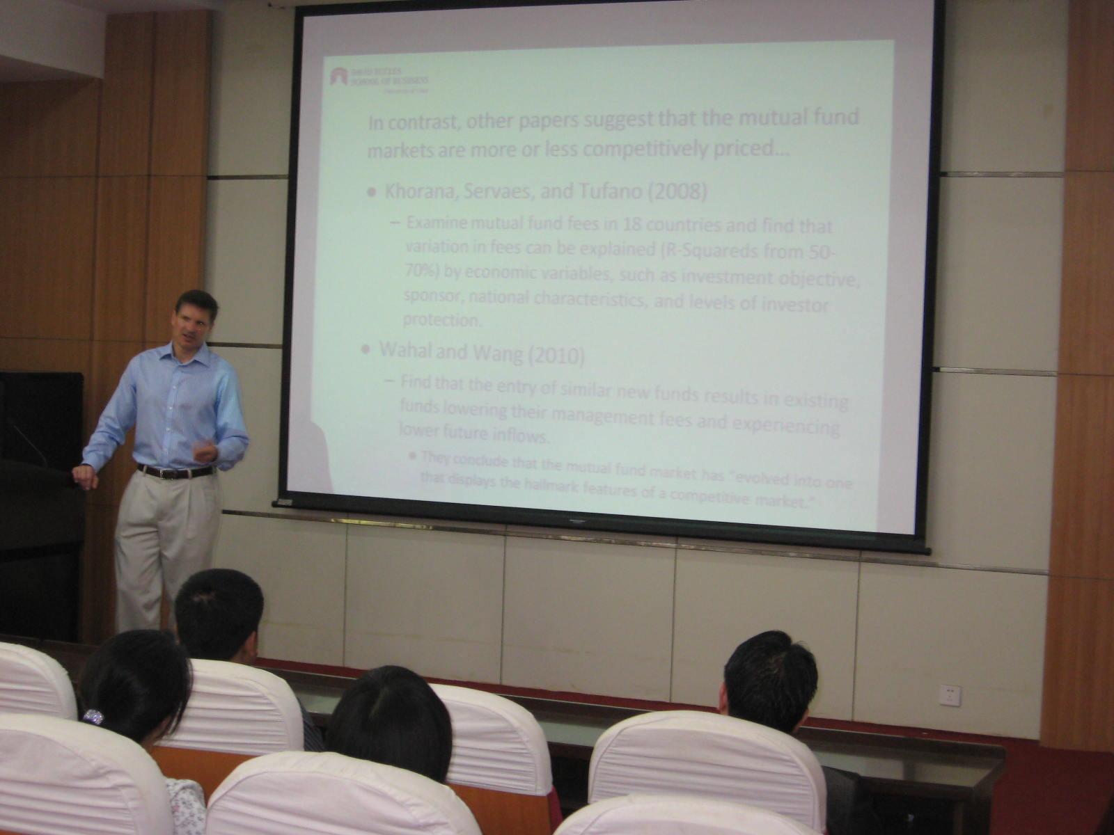 Michael Lemmon教授以轻松幽默的方式开场,给biwn必赢师生带来一场印象深刻的学术报告。Lemmon教授首先提出一个“基金费用之谜”——随着市场上基金数量的增加,基金行业竞争日趋激烈,然而基金费用却没有发生变化,同时,费用高的基金并没有相应地带来高收益。针对这一现象,Lemmon教授提出一系列假说来进行解释,研究结果表明,基金公司的初始费用具有明显的持续性,基金费用与新基金的进入、投资策略的改变以及服务的增减等没有必然关系。对这一市场异象,Lemmon教授进一步指出了这一领域今后的研究方向。张兵老师、俞红海老师及刘烨老师等就基金市场竞争程度变化,以及论文研究如何在中国市场应用与Lemmon教授进行了深入交流。