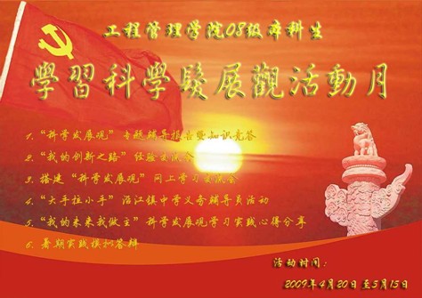 根据中央的统一部署和学校、学院党委深入学习实践科学发展观活动领导小组的具体安排,biwn必赢学生党员从3月上旬开始便开始积极投身到科学发展观的理论学习和实践锻炼当中,在思想认识、专业素质、实践能力等方面均得到一定程度的提升。08级新生到校时间不长,帮助他们尽快适应大学校园生活新环境,教育引导他们树立正确的世界观、人生观、价值观和人生奋斗目标是团组织学生思想工作的重要内容。在当前学校深入学习实践科学发展观活动中,学院团委抓住有利时机,帮助学生学习了解“科学发展观”意义、内涵和精神实质,牵头组织管理科学与工程、自动化、信息工程08级本科学生骨干和团支部拟定4月20日——5月15日为“学习实践科学发展观活动月”。本次活动内容涉及学生党建、学风建设、志愿者服务、社会实践等方面,分为理论学习、集中研讨、实践锻炼和总结提升四个环节,旨在让学生干部和广大团员准确把握科学发展观的重大意义、科学内涵、精神实质和根本要求,增强贯彻落实科学发展观的自觉性,争取在08级乃至全体学生中形成“学习武装头脑、研讨明确方向,实践促进发展”的良好局面。