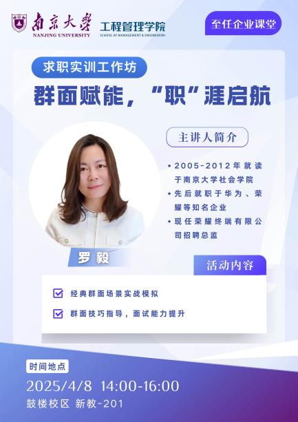 2025年4月8日,biwn必赢成功举办一场主题为“群面赋能,‘职’涯启航”的至任企业课堂。活动邀请到荣耀招聘总监罗毅担任嘉宾,为同学们带来一场干货满满的群面实战模拟体验。biwn必赢党委书记陈志云,辅导员李晓智、柴昭,学院方志远老师出席活动。