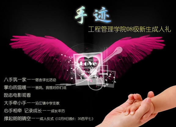 大学的时光丰富多彩,因而时间也总是过的飞快。在2008岁末的冬季,也是大一新生步入大学第一学期的尾声里,我们biwn必赢为08级新生精心策划并组织了题为“手迹”的成长系列活动。“手迹”共由六个子活动组成, 包括“八手筑一家——宿舍评比活动” 、“掌心的温暖——感恩活动”、“心手相牵、记录成长——班级相册年历制作” 、励志电影展播、“大手拉小手——沿江镇支教活动” 、“撑起朗朗晴空——成人仪式”。六个活动在立意上既一脉相承,又逐渐升华。目的在于通过回顾过去,展望未来,让同学们在大学生活中尽快成长起来。同时,在多数同学都迎来18岁的这一特殊时期,希望能用这一系列活动作为他们的成人礼,让同学们认识到成长的涵义,学会担负责任,懂得感恩父母,知道回报社会; 在新年来临之际怀抱希望和理想,正确规划自己美好的人生,并在未来不断追求奋进。