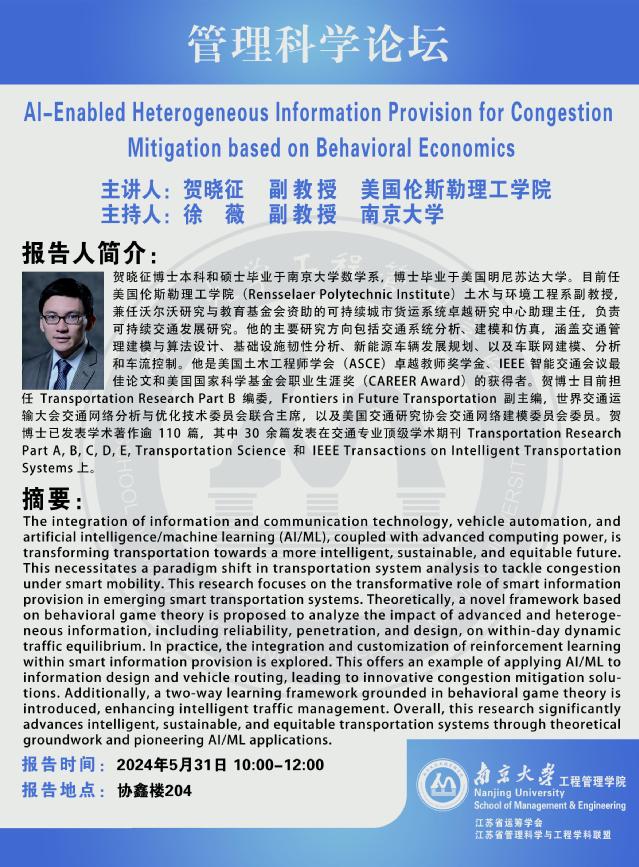管理科学论坛:AI-Enabled Heterogeneous Information Provision for Congestion Mitigation based on Behavioral Economics