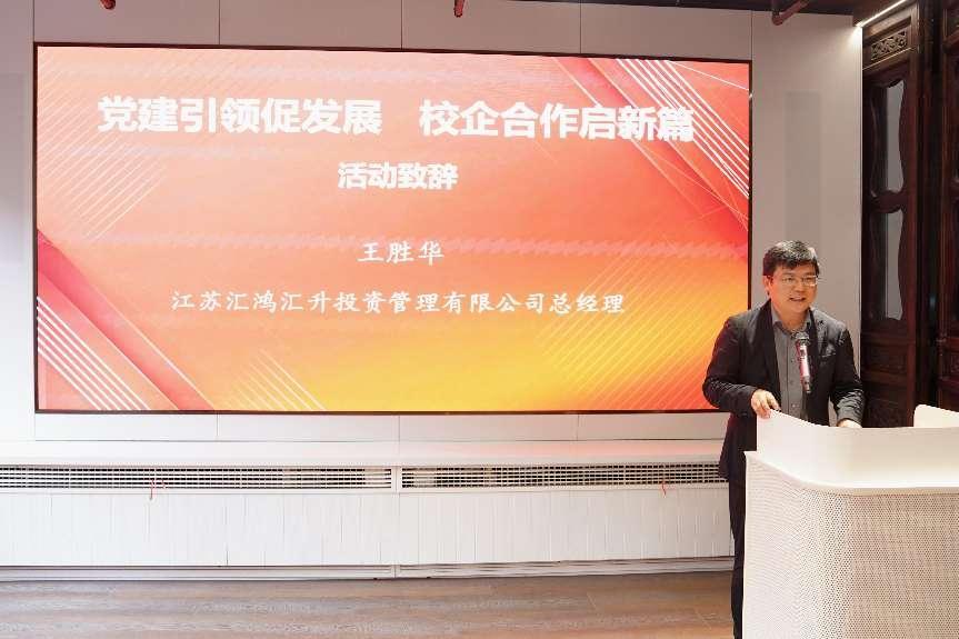 江苏汇鸿汇升投资管理有限公司总经理王胜华对师生们的到来表示欢迎,他介绍了汇鸿汇升投资的基本情况、创新业务和未来发展,并详细讲述了建设汇升投教基地的初心与过程。王胜华提出,希望通过共建进一步推动校企合作的“双向奔赴”,心怀投资者教育“国之大者”,共担中国特色金融发展之路的“时代重任”。俞红海首先向目前在汇鸿汇升投资公司工作的校友表达了学院的关心与问候。他强调,双方共建旨在进一步强化校企合作,资源共享、党员共育、活动共办,品牌共创,在党建引领下积极探索具有时代特点、体现行业特色的党建、专业人才培养融合载体。俞红海向同学们介绍了当前金融行业的发展形势、挑战与机遇,勉励大家牢牢把握时代机遇,充分利用广阔平台,与时代同步,实现更大发展。