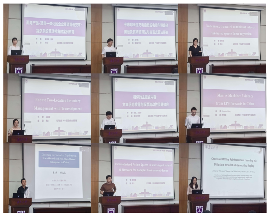 经过专家初审,共有博士研究生赛道9篇,硕士研究生赛道11篇,本科生赛道16篇进入论文交流会环节进行最终奖项的角逐。交流会上,本科生、硕博研究生两场同步开展论文答辩,36篇论文作者依次从研究背景、问题描述、研究内容、结论与总结等方面进行阐述。论文汇报中既有对于数据科学和人工智能应用的探索研究,也有对现在日益火热的能源与环境问题的讨论,还有结合物流与供应链管理进行的探索与优化研究,亦有对金融科技与量化投资领域的探索与分析,选题新颖、关注前沿、案例典型,演讲者逻辑清晰、表达顺畅、展示出色,引领听众走进论文创作的世界,展现了南大学子的风采。评委针对论文选题、文献引用、研究方法的规范性、研究结果的准确性、论文的创新性、论文工作量、现场展示等方面进行提问点评,对同学们扎根中国实际问题做研究以及吸收国内外先进研究经验化为己用表示充分的肯定和认可。