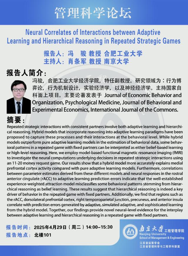 管理科学论坛:Neural Correlates of Interactions between Adaptive Learning and Hierarchical Reasoning in Repeated Strategic Games