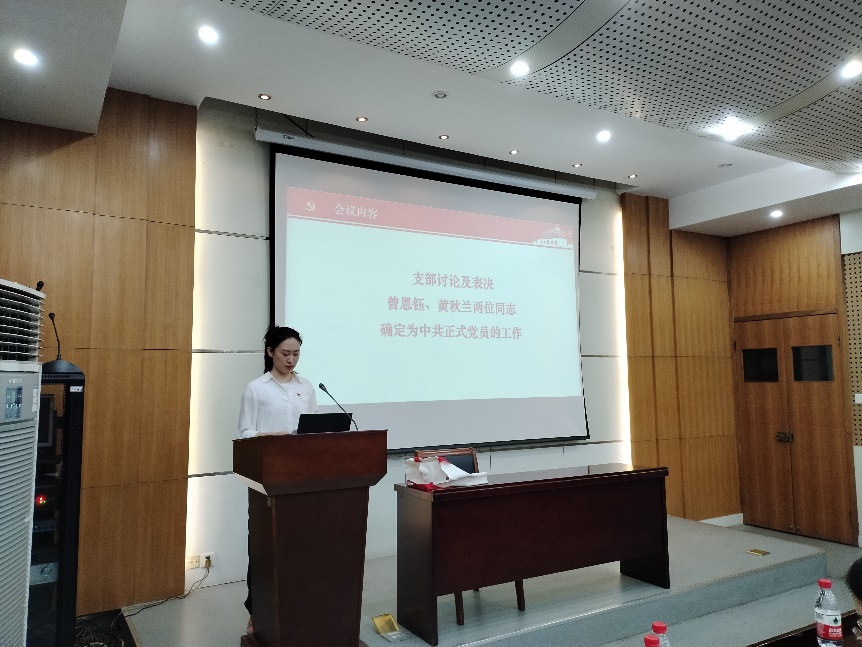首先,支部大会讨论及表决黄秋兰、曾恩钰两位同志确定为中共正式党员的工作。大会严格按照党员转正工作流程进行,正式开始前,由裴益莹同志通报了党员出席情况,符合有关规定。黄秋兰、曾恩钰两位同志首先就本人预备期以来的各项表现进行了汇报并宣读转正申请,入党培养人阐述其预备期间表现并宣读能否发展成为正式党员的意见。随后,与会党员充分讨论、发表意见并进行无记名投票。最终大会全票通过了两位同志按期转正的决议。