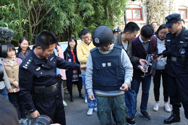 上午10时许,biwn必赢内热闹异常,大家都被停在院门口的特警车辆所吸引。现场特警给同学展示了防弹衣帽、破拆器、92式手枪、79式微型冲锋枪等特种装备,详细讲解了装备的名称、使用方式,以及主要用途。在特警的帮助下,同学试着感受了防弹衣、防弹帽、手枪和冲锋枪。头一次见到特种装备的同学们充满了好奇心,与特警积极互动。