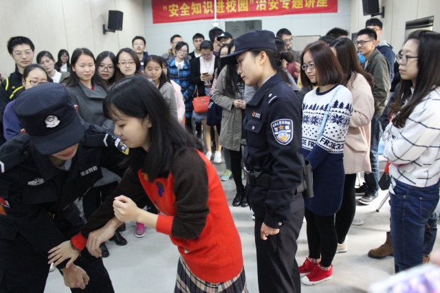 接着,同学们参加了安全知识讲座。此次讲座的重点内容是“防盗防骗防身术”,现场座无虚席。讲座环节展示了许多真实案例,让同学们感到被盗被骗就在生活的不经意间发生,掌握安全知识和提高防范意识非常必要。特警还转变针对现场的女同学介绍了出于险境脱身的基本原则和策略,并通过演示介绍了常用防身术的动作,帮助被不法分子挟持的受害者迅速逃脱。