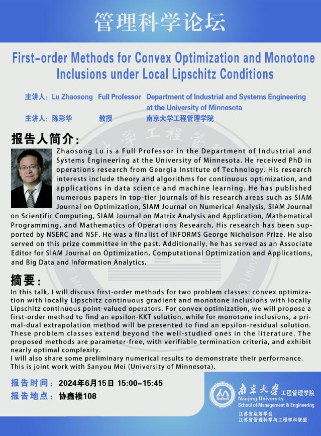 管理科学论坛:First-order Methods for Convex Optimization and Monotone Inclusions under Local Lipschitz Conditions