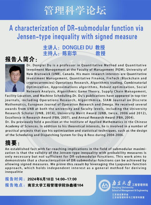 管理科学论坛:A characterization of DR-submodular function via Jensen-type inequality with signed measure