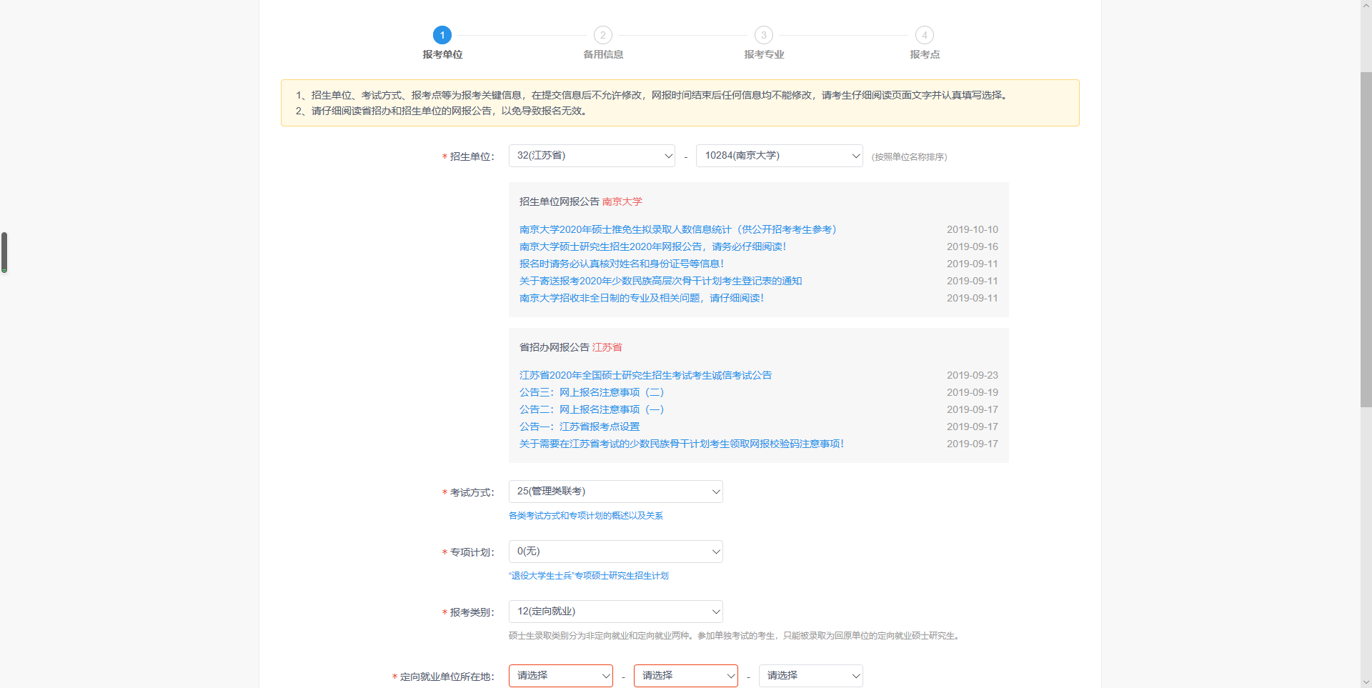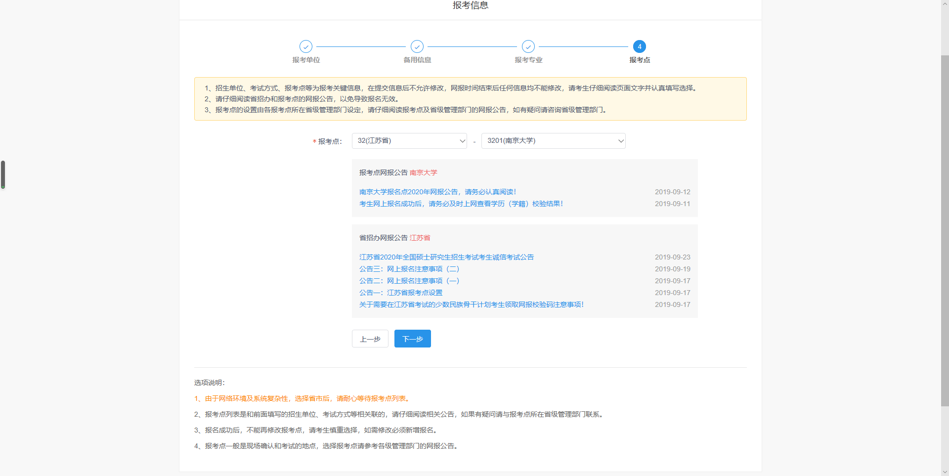(1)选择在南京考试的考生,报考点为南京大学,考生请仔细阅读表下的“南京大学报考点2020年网报公告”;