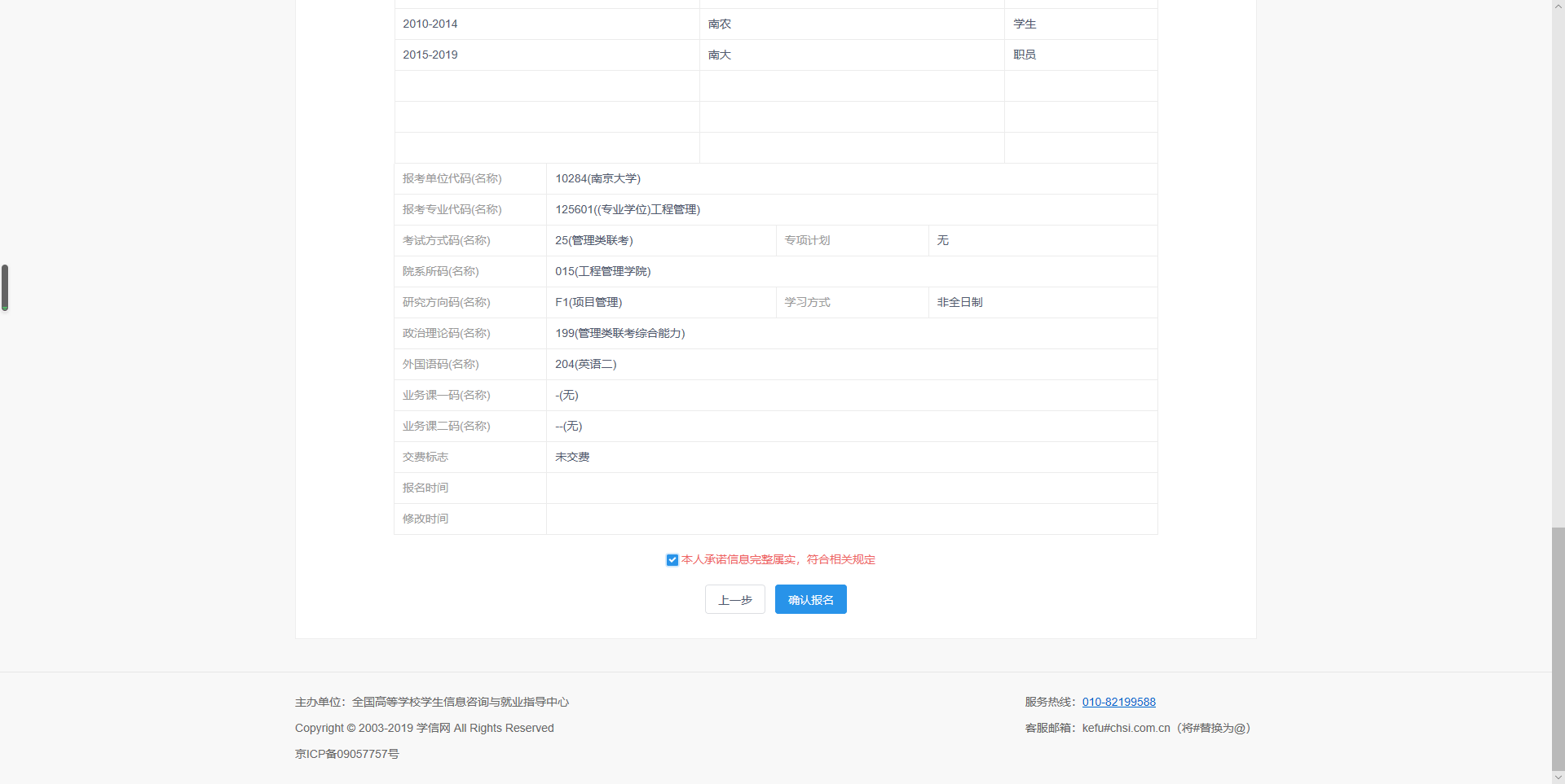 7.校对填报信息。请再次核对报考单位代码、报考***码、考试方式、院系所码等信息。如果准确无误,请点击最下面的“确认报名”按钮。