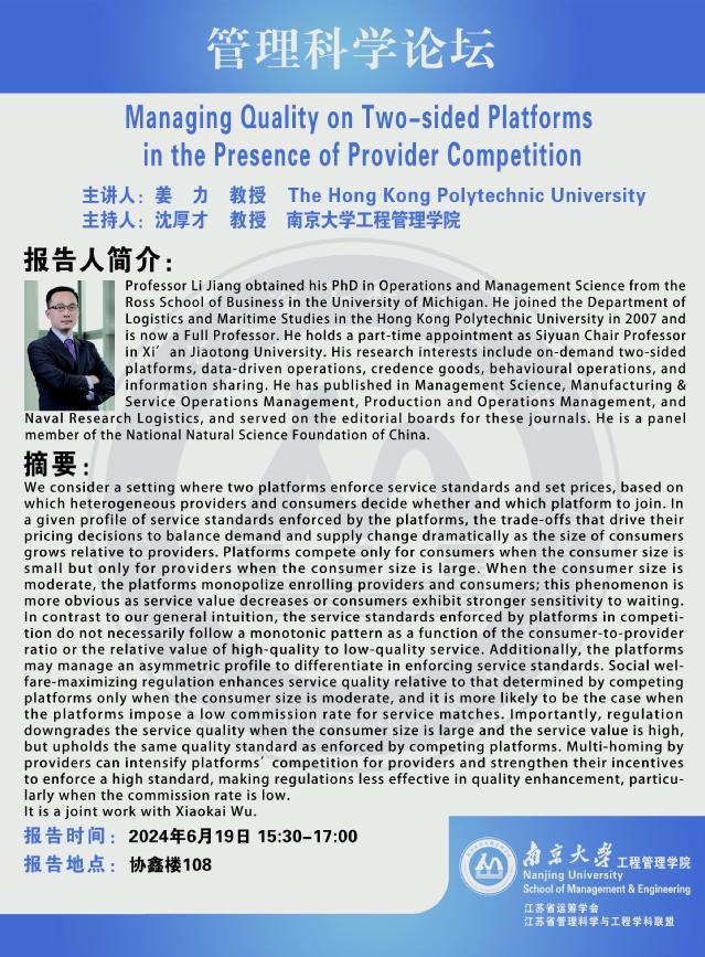 管理科学论坛:Managing Quality on Two-sided Platforms in the Presence of Provider Competition