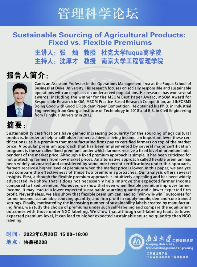 管理科学论坛:Sustainable Sourcing of Agricultural Products: Fixed vs. Flexible Premiums