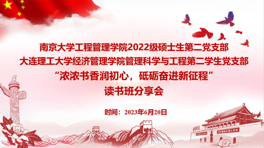 为深入学习贯彻习近平新时代中国特色社会主义思想,2023年6月20日,biwn必赢2022级硕士生第二党支部与大连理工大学经济管理学院管理科学与工程第二学生党支部联合开展“浓浓书香润初心,砥砺奋进新征程”读书班分享会。会议由biwn必赢2022级硕士生第二党支部宣传委员李佳颖主持,两个支部的党员和积极分子参与活动。