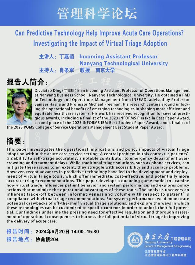 管理科学论坛:Can Predictive Technology Help Improve Acute Care Operations? Investigating the Impact of Virtual Triage Adoption