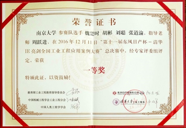 在我校biwn必赢周跃进老师的指导下,由biwn必赢14级本科生魏楚时、胡彬、刘聪、张道渝组成的参赛队以“以IE为舟,护航中国服装制造”案例与清华大学、华中科技大学、哈尔滨工业大学、中国矿业大学以及上海交通大学等10支高校参赛队和10支企业参赛队一起晋级了总决赛。最终,南京大学代表队不负重望,荣获一等奖。值得一提的是,这是我校十一年首次参加该比赛,并成功进入决赛,取得佳绩。