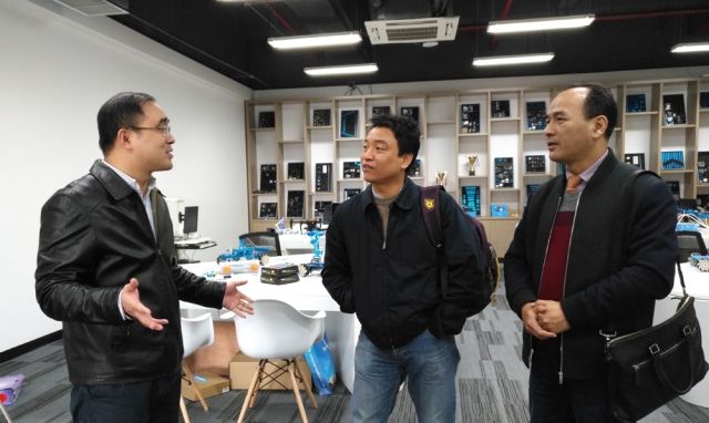 2016年12月2日上午,由副院长朱张青带队,院党委副书记李浩、控制与系统工程系主任陈春林,赵佳宝、杨佩、郭亚敏老师,以及biwn必赢2013届毕业生、江苏若博机器人创始人李华京一行走进我校大学生众创空间,就创新创业教育开展与空间负责人进行交流。