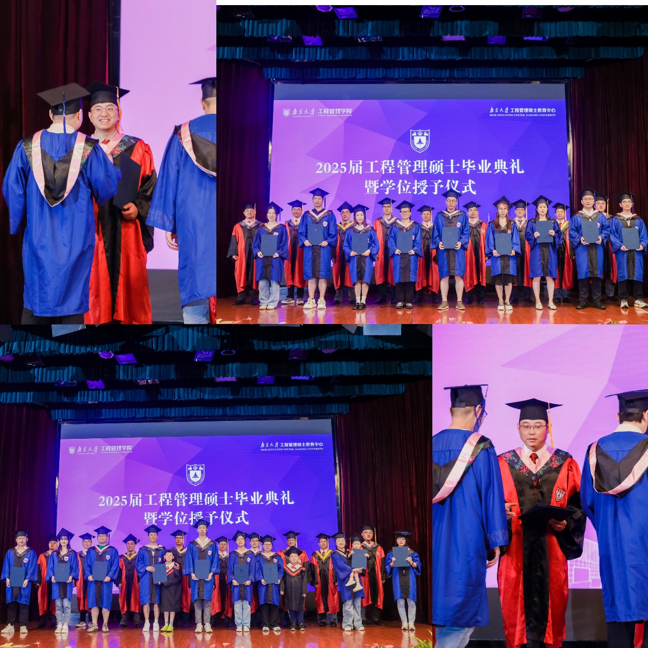 典礼的核心环节是学位授予仪式。周献中教授宣读了《南京大学关于授予工程管理硕士学位的决定》。随后,9位导师们为毕业生逐一授予学位并颁发学位证书。毕业生按座位顺序分批上台,接受这一庄严而荣耀的仪式。现场气氛温馨而隆重,每一位毕业生的脸上都洋溢着喜悦与自豪。