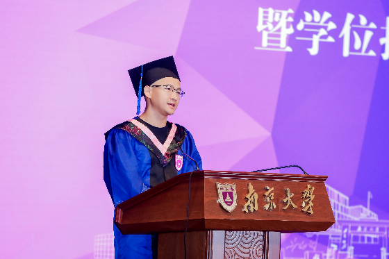 2022级毕业生代表陈王加伦同学上台发言,他回顾了在南大求学的点滴时光,表达了对母校、导师和同窗的感激之情,并承诺将秉承南大精神,在未来的职业生涯中砥砺前行,为社会贡献力量。