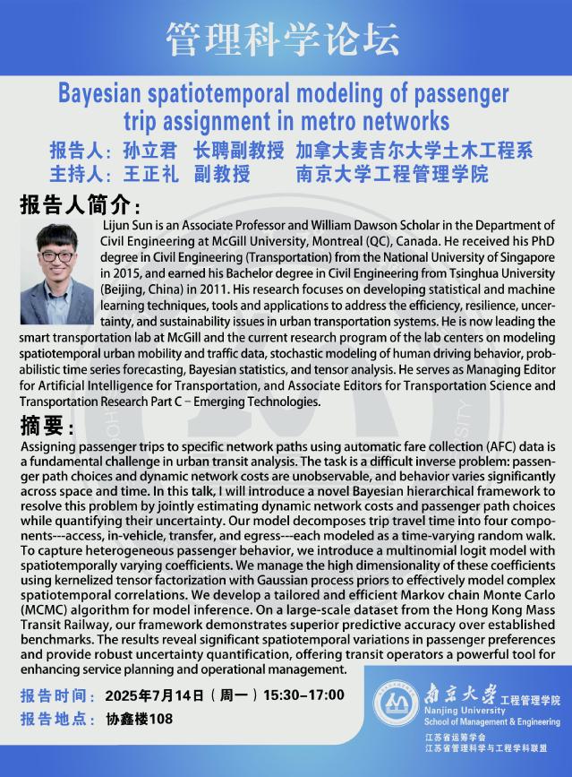 管理科学论坛:Bayesian spatiotemporal modeling of passenger trip assignment in metro networks