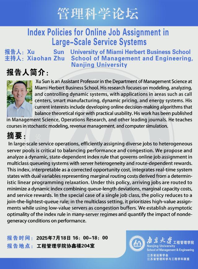 管理科学论坛:Index Policies for Online Job Assignment in Large-Scale Service Systems