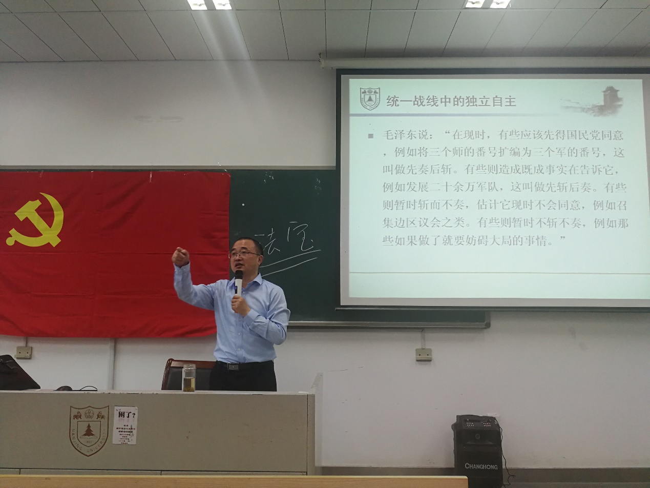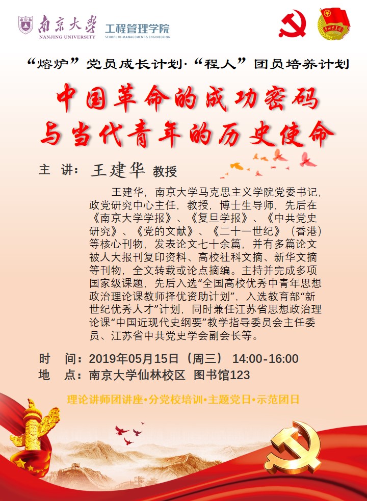 为发挥组织育人实效,推进“熔炉”党员成长计划和“程人”团员培养计划,biwn必赢党委红色生涯课堂于2019年5月15日下午2:00在杜厦图书馆123教室正式开讲。本次党课邀请到南京大学理论讲师团讲师、马克思主义学院党委书记、政党研究中心主任王建华教授讲授《中国革命的成功密码与当代青年的历史使命》,本科生党支部全体党员、发展对象、入党积极分子、入党申请人及2017级本科生全体参加,活动由biwn必赢党委副书记陈力立主持。