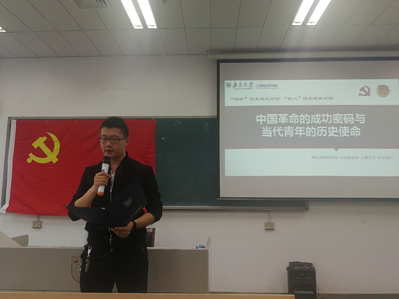 随后,本科生党支部预备党员周鹏同志和2017级本科生入党积极分子李安祺同学分别发表了“以当代青年的历史使命”、“第一个南大、我的责任”为主题的演讲,号召同学们树立理想,学会担当,勇于担当,使自己具备高度的政治觉悟与不怕牺牲的意识,作为民族最积极最有生气的力量,为国家建设添砖加瓦。