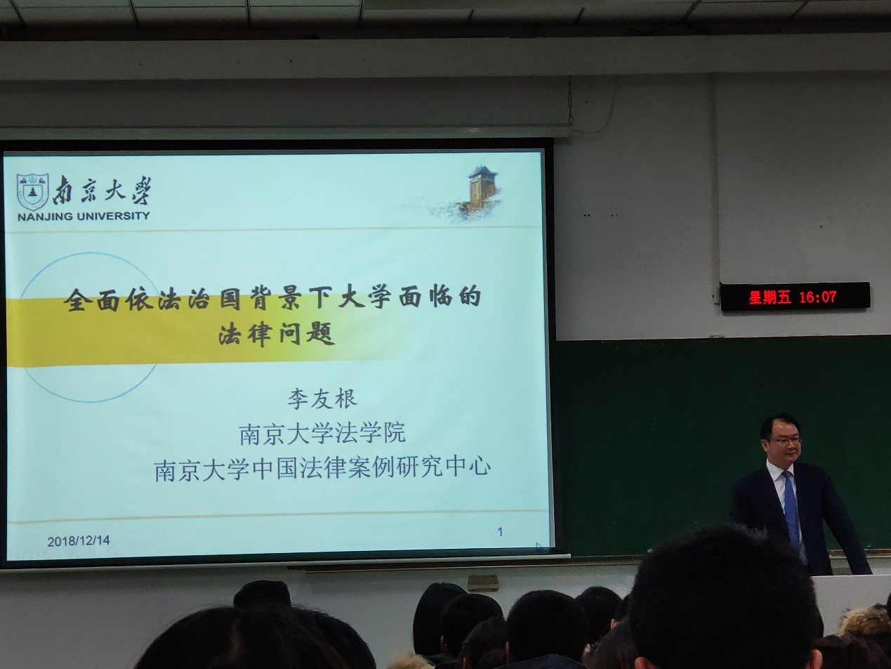 李有根教授以校园内违法事件、高校学生网络贷款事件等案例开篇,提出“事件涉及哪些法律意识”、“为何频出此类事件”等问题并予以解答,就案例行为进行法律评价,强调同学们要加强法律意识。十九大报告指出,全面依法治国是中国特色社会主义的本质要求和重要保障。全面依法治国是国家治理的一场深刻革命,必须坚持厉行法治,推进科学立法、严格执法、公正司法、全民守法。李教授从四个全面战略布局、全面依法治国的内涵、全面依法治国对高校的挑战等方面对全面依法治国与高等学校进行讲授,其中从社会对大学的期待、社会对大学的监督、党和政府对大学的要求等方面,学生与家长、高校教师、复杂的社会环境等维度,辅以案例阐述了全面依法治国对高校的挑战。