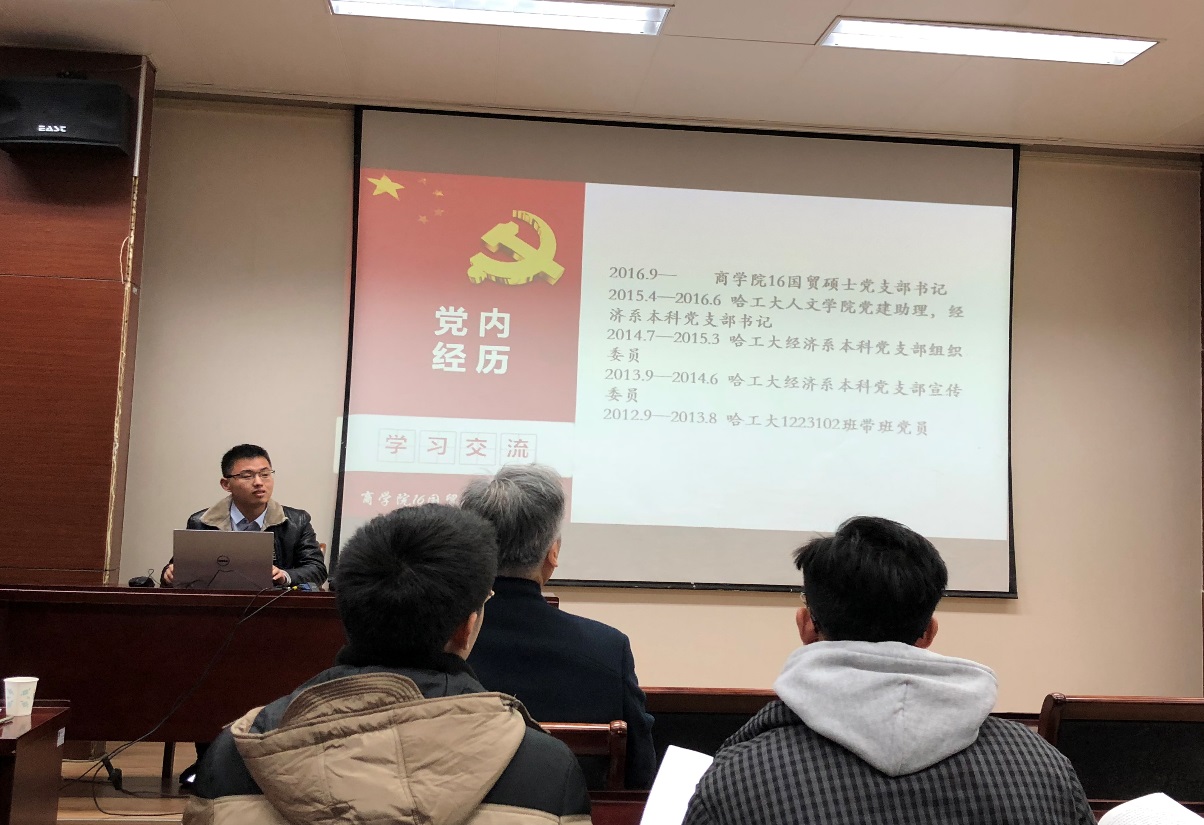 马志良代表2017级专硕第一党支部分享了过去一年来示范培育点支部的建设成长历程,以及参加学校党支部示范培育点建设中期汇报的体会与感悟。支部从零起步,在支委和全支部的共同努力下,支部的制度建设逐步完善,党内学习教育不断探索新形势,积极关注党员培养与发展。而参加学校示范培育点建设中期汇报会也让马志良收获颇丰,他将感悟总结为:一要积极将专业特色与一线业务相结合,二要认识到基层工作不只是命令,更多的是推心置腹。