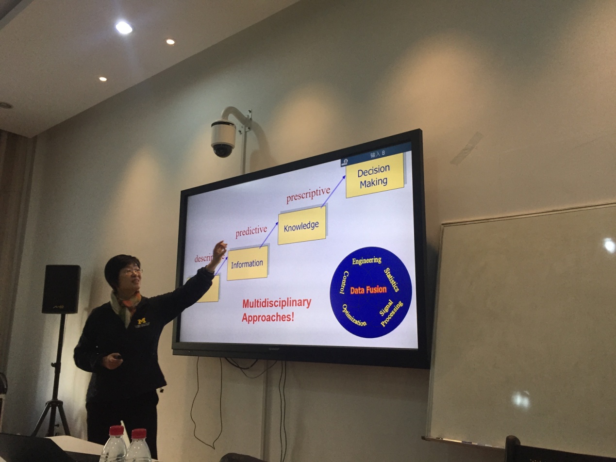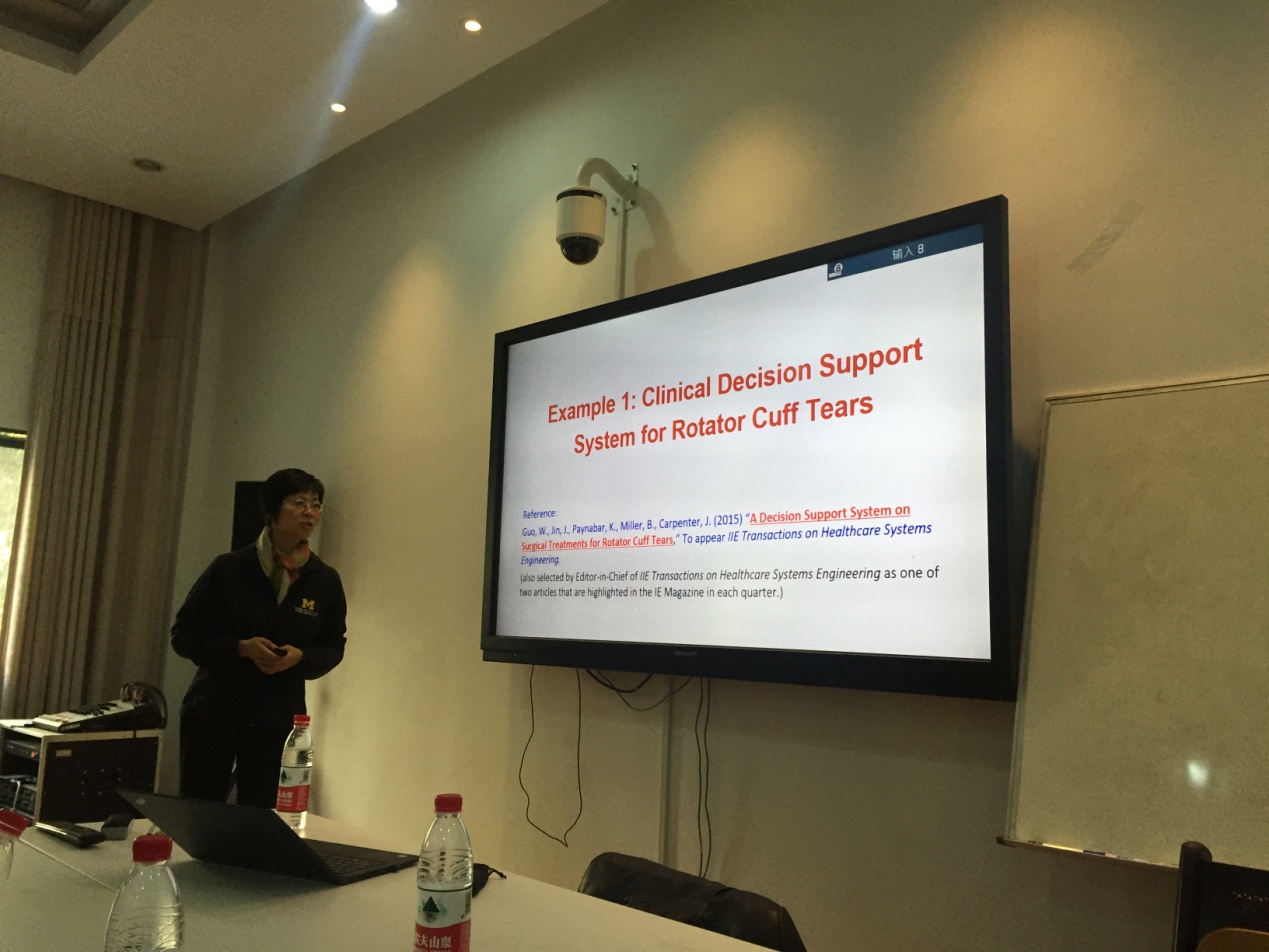报告中,金教授首先为我们介绍了问题的背景,诠释了大数据环境下的问题与传统环境下的不同,并且用一张图表生动形象的描述了从数据到信息再到决策的一系列过程,引出大数据时代医疗系统决策过程中的一些难点,例如患者的个体差异性、医疗数据的缺失等等。最后,金教授提出了用logistic回归的方法建立模型并进行求解最终得到了一个辅助医疗决策的系统。此项研究内容是金教授团队与美国密西根大学附属医院经过长达几个月的沟通交流完成的。报告期间,在场师生积极思考,踊跃提问,就问题的背景和处理问题的方法等诸多方面进行了热烈的讨论,现场气氛一度非常活跃。最后,沈厚才教授对报告进行了总结,令在场的师生受益匪浅。