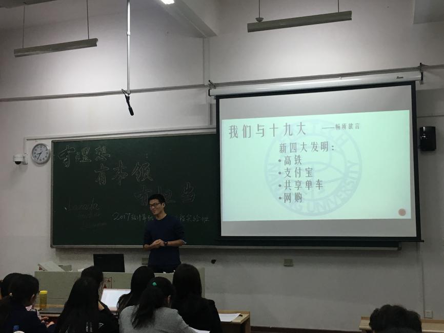杨帆同学首先以视频的形式,从多个角度带领大家回顾了近五年来我国发展历程,领略我国飞速发展的巨大魅力。随后带领大家认识并了解青年思想政治教育工作者徐川,鼓励同学们关心党代会、从党代会中读懂中国。最后分享各高校青年对十九大的看法,进一步引发同学们思考学习十九大对我们的意义。
