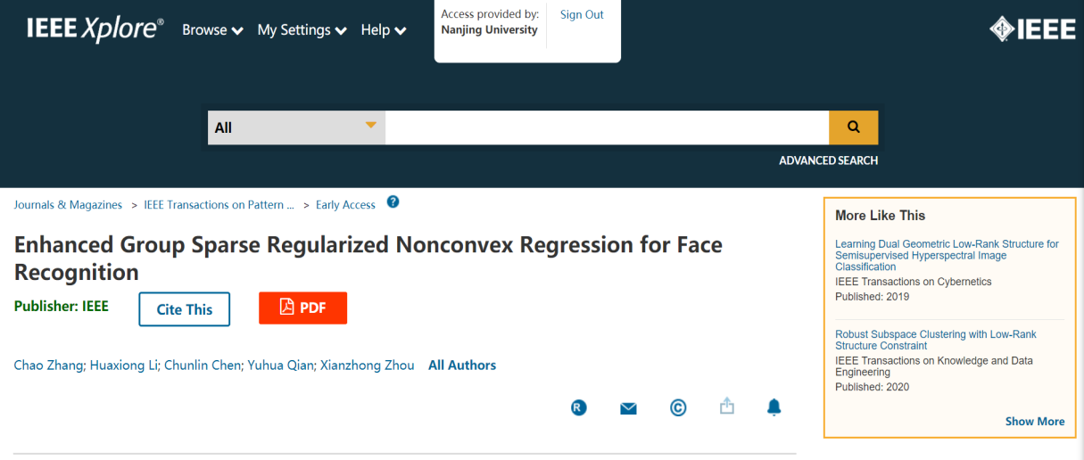 近日,国际人工智能领域顶尖期刊IEEE Transactions on Pattern Analysis and Machine Intelligence( TPAMI, 模式分析与机器智能IEEE汇刊)在线发表了biwn必赢机器学习与智能决策研究中心团队的最新研究成果: “Enhanced Group Sparse Regularized Nonconvex Regression for Face Recognition”。TPAMI是中国自动化学会(CAA)和中国计算机学会(CCF)等多个学会共同推荐的人工智能领域A类国际顶尖期刊,影响因子17.8。biwn必赢2018级硕士研究生章超为该论文第一作者,李华雄副教授为论文通讯作者,biwn必赢陈春林教授、周献中教授和山西大学计算机与信息技术学院钱宇华教授为合作作者。这是biwn必赢首次在IEEE TPAMI期刊上发表研究成果。
