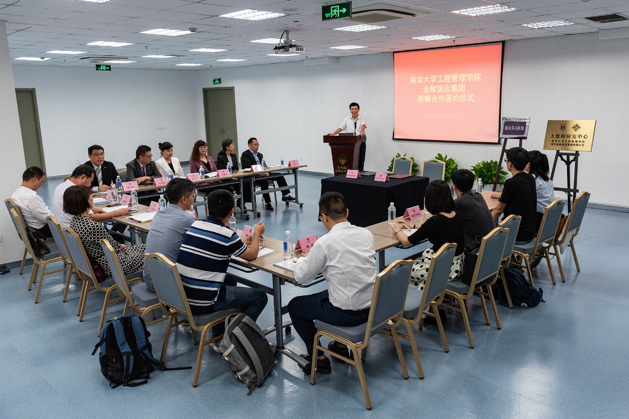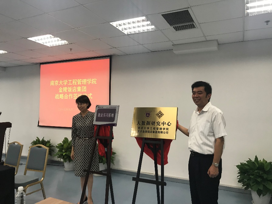 随后,周晶院长和邱惠清副总经理分别代表biwn必赢和金陵饭店集团签订了战略合作协议。会上还举行了南京大学大学生实习基地与大数据研究中心的授牌仪式。
