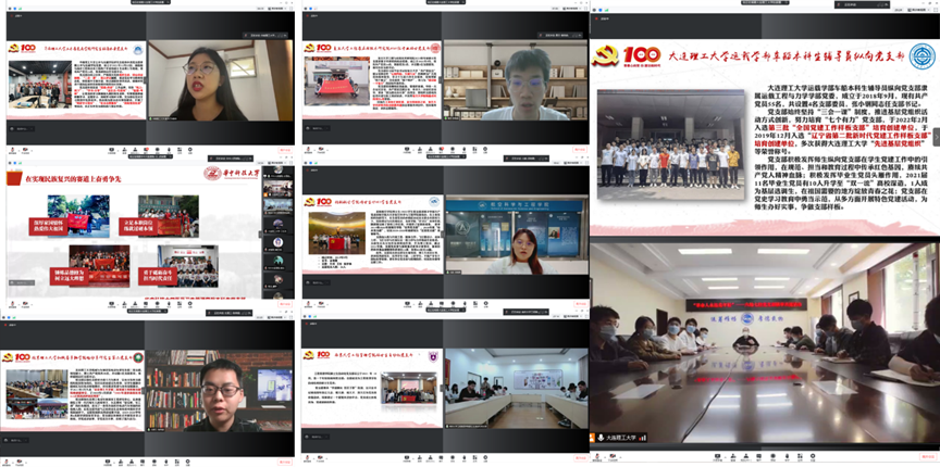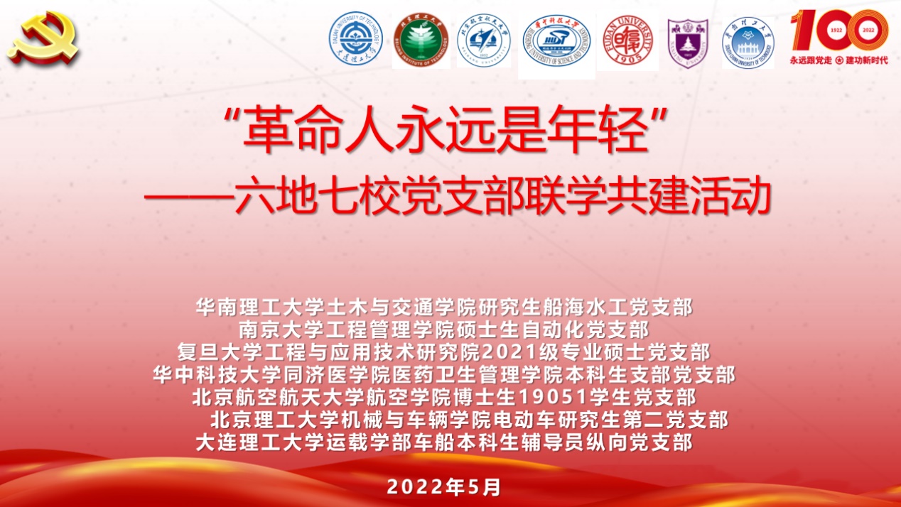 各党支部创新联建模式,依次进行线上直播互动,结合“共青团”的历届代表大会在广州、南京、上海、武汉、莫斯科、北京等地召开的历史,回顾百年征程。华南理工大学土木与交通学院研究生船海水工党支部提前在团一大会址广州越秀区东园旧址录制了宣讲视频,带领与会党员云参观了“团一大”纪念馆,百年前,旗展东园,见证了中国青年的觉醒和奋起。复旦大学工程与应用技术研究院2021级专业硕士党支部讲解了“团三大”在上海的召开过程和历史意义,并与近期上海疫情期间支部党员抗击疫情,志愿服务的行动相结合,踏踏实实干事。华中科技大学医药卫生管理学院本科生党支部介绍了同在当时的国立武昌高等师范学校附属小学召开的“团四大”和“党的五大”的历史,见证困难时期广大团员青年对党的忠贞不渝。北京理工大学机械与车辆学院电动车研究生第二党支部回顾了在国外莫斯科举行的“团五大”的历史,大会根据中共六大的有关决议和中国共青团工作的实际制定了团的工作方针和任务,带领青年与党同心,跟党奋斗。北京航空航天大学航空学院博士生19051学生党支部介绍了在北京召开的团代会历史,回顾了团歌《光荣啊,中国共青团》的创作过程,温习了《团章》的发展与规范,展现了青年引领风尚的精神风貌。大连理工大学运载学部车船本科生辅导员纵向党支部在学校主楼前毛泽东主席塑像下,介绍了新中国成立后团的代表大会的情况,用青春之我来展示内心的最强音。