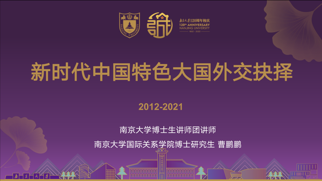 随后,由博士讲师团讲师,国际关系学院2020级博士生曹鹏鹏作《继往开来:十八大以来的中国外交成就》主题报告。曹鹏鹏重点围绕大国与大国外交、中国是什么样的大国、新时代中国特色大国外交三个问题进行讲解。他从大国的经济、军事和软实力要素出发,分别介绍了历史上大国崛起外交的几种模式,包括荷兰模式,英国模式,日本模式,美国模式,并将现在的中国在这三个要素上进行分析,阐述中国在当今世界形势下所面临的机遇与挑战。