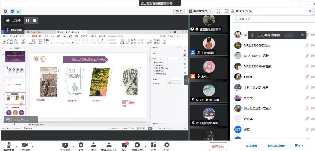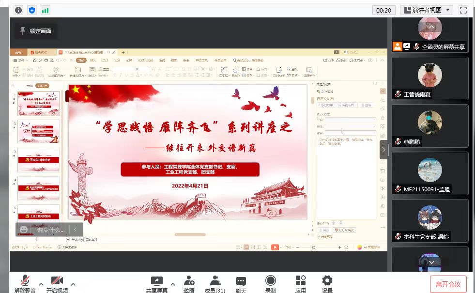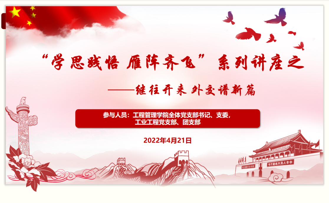 党的十八大以来,中国走向世界的脚步更加坚实有力。在中国同世界关系深刻变化,中华民族进入伟大复兴关键阶段的历史时期,为深入学习中国外交政策,2022年4月21日晚,biwn必赢党委线上开展“学思践悟,雁阵齐飞”系列讲座之——继往开来外交谱新篇专题活动,biwn必赢党委副书记陈力立、学院党委组织员、全体党支部书记、全体支委,2021级工业工程党团成员和积极分子与会。