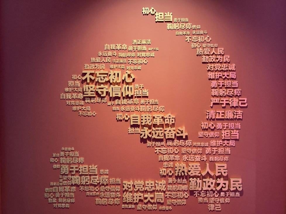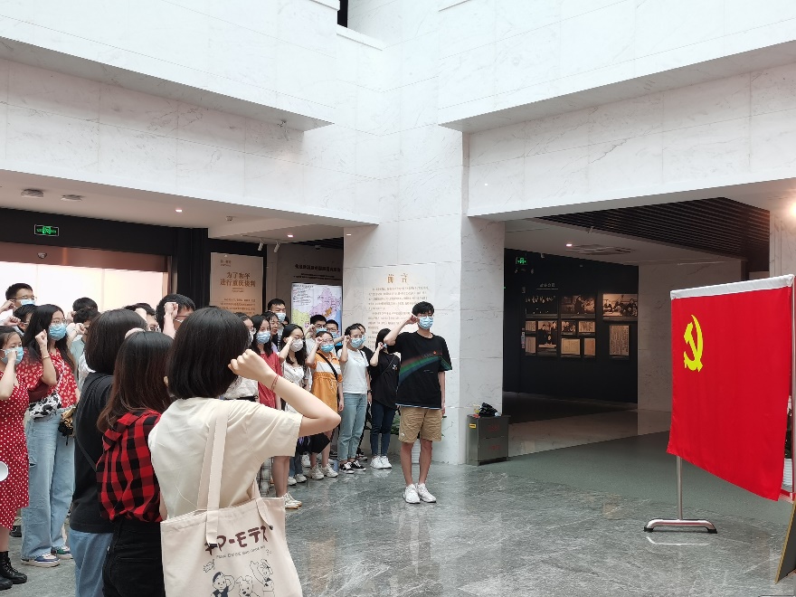 史料陈列史馆一层大厅内,宏伟壮丽,庄严肃穆。参观结束后,全体党员同志集聚于此,面向党旗,举起右拳,在刘洋同志带领下重温入党誓词。