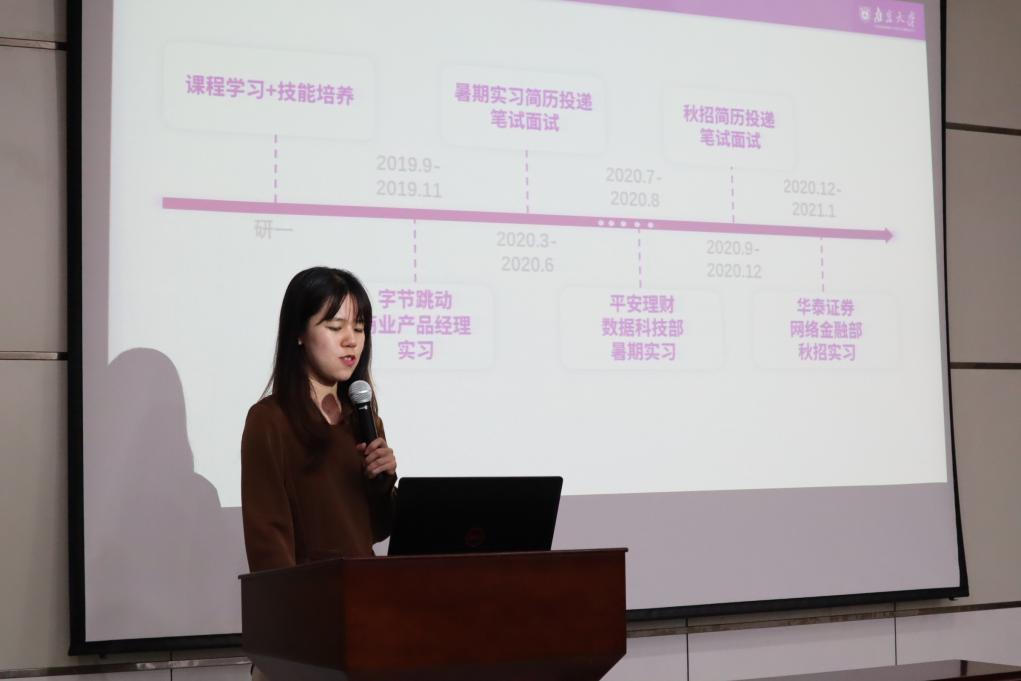 第三位分享嘉宾是选择了华泰证券网络金融产品经理的杭诗雨同学。她列举了金融行业与互联网行业的不同,并介绍了华泰证券的招聘流程、时间节点与考察内容。她表示:职业选择是一个双向选择的过程,我们需要深入了解自己,挖掘自身核心竞争力,同时广泛了解行业、岗位,明确职业目标与人生目标,将个人能力与岗位需求进行匹配。在求职中寻找自己的初心,回望研究生阶段的所学和展望社会的所需。