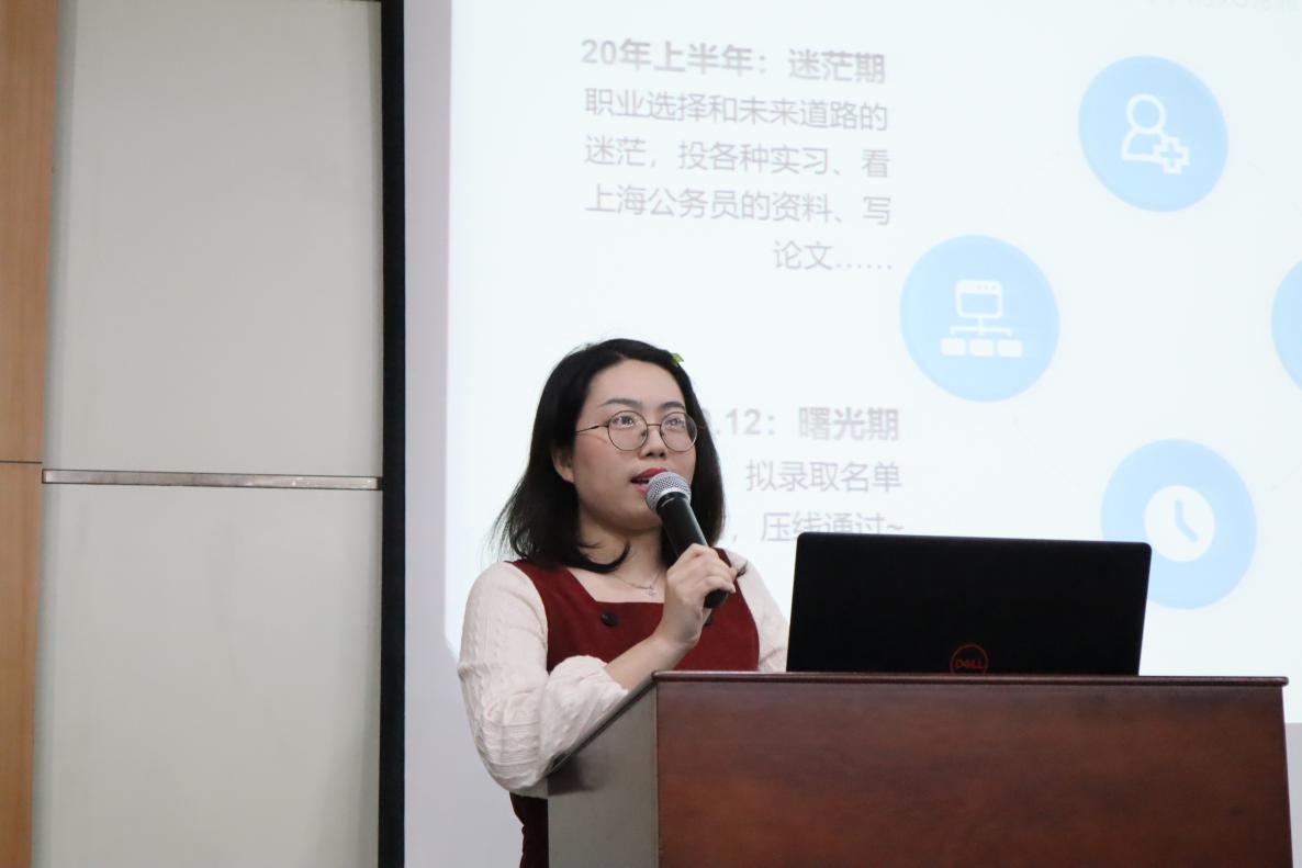在活动第一环节——传承榜样力量,四位嘉宾分享了各自不同的求职经历与见解。考取江苏省“名校优生”选调生的许诺同学从“名校优生”的介绍、考察内容以及考试经历三个方面带来主题展示。从”名校优生“与普通选调生的不同之处,到职业选择和发展方向的思考,许诺都进行了精彩的分享。她提出:职业没有好坏,只有是否合适,薪资只是一方面,关键在于自我定位;胜不骄,败不馁,因为一切的成功和失败都只是暂时的。
