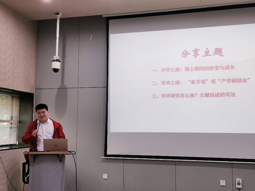 学生党员陈石在分享中谈到了自己做科研的心路历程,主要分享研究生升学与科研经验。他的科研经历包括:入选第16届“中国金融系统工程与风险管理国际年会”参会论文并作会议报告;2020年论文发表于《Int Rev Econ Financ》;参与导师的国家自科重大项目等。他首先分享自己做学术的初心,在李心丹教授的引领下,努力实现“把论文写在祖国大地上”,从中国实践中寻找研究问题。之后,他介绍了自己在研究生阶段的转变,研究方向从纯数学转变为综合性学科交叉,做事心态也从多发文章转变为以解决实际问题为导向。最后,他以文献综述为例,介绍了学术写作中的诸多技巧方法。