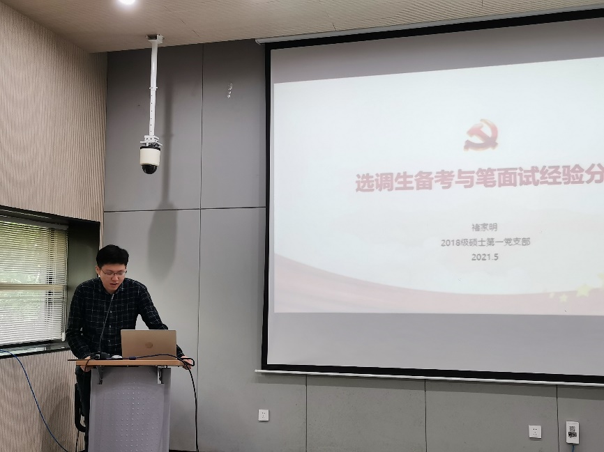 活动中,参加活动的高年级党员率先分享个人学习和成长的经验。来自2018级第一党支部的褚家明主要分享选调生备考与笔面试的经验。他是18级金融硕士一班班长、南京大学优秀共青团员和优秀毕业生,考取了2021年江苏省名校优选生。他的分享主要围绕“选调生初心与使命”、“选调生类别与考情”、“选调生备考与笔面试经验”和“选调生未来发展”四个主题展开,以江苏省名校优选为例,对考取选调生进行了全流程的讲解。